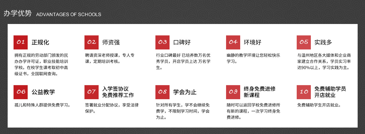 我校以培養(yǎng)實用型專業(yè)人才為目標,理論學(xué)習(xí)、操作訓(xùn)練與專業(yè)實踐三位一體,實行一對一的教學(xué)模式,常年招生,男女不限。畢業(yè)后推薦工作、 主要是以理論為輔實操為主的教學(xué)模式授課。老師手把手教、一對一輔導(dǎo),為學(xué)員量身定做課程,保證學(xué)會為止、 中途不收取任何費用,(無任何隱形消費)進修新的課程。、簽約教學(xué)、幫助學(xué)員開店就業(yè),免費試學(xué)(讓您全方位的體驗我們的專業(yè)、讓你不花一分冤枉錢。)